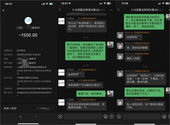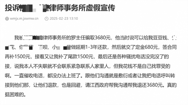 有網友在“文明江西”平臺投訴反映,自己因找到中介,辦理包含豆豆錢、安x花、x唄等平臺在內的,所謂延期1-3年還款的“債務托管”業務被騙,顯示交了定金680元,簽合同再補1500元,接著又讓當事人補了尾款1500元,最后還是各種騷擾電話沒完沒了的接,遲遲未能奏效,后續尋找中介溝通敷衍,讓中介退款,也是回避。