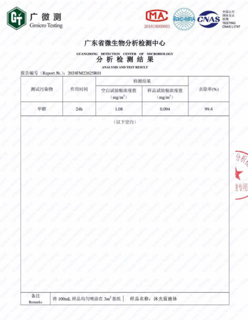 以上沐光藍甲醛清除劑的CMA認證的質檢報告