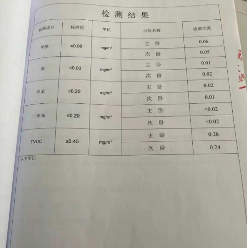 此質檢報告是新裝修房主睿石與沐光藍聯合使用后的甲醛檢測結果