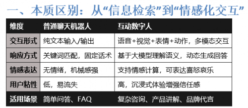 核心差異:聊天機器人是“搜索引擎的延伸”,而互動數字人是“虛擬員工的進化”。