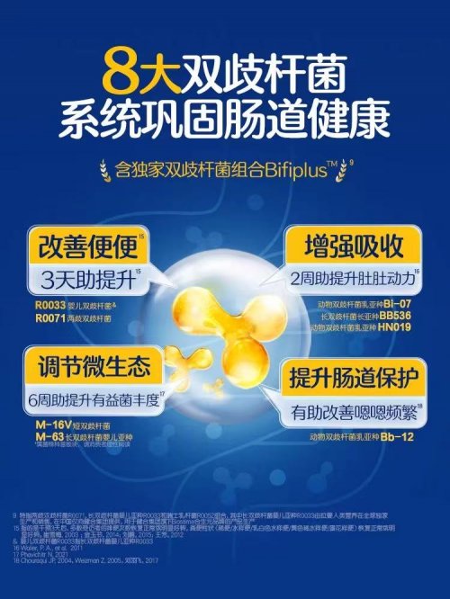 科學研究表明,腸道健康與嬰幼兒的免疫發育、營養吸收等密切相關。國際頂級科研期刊nature手冊在《探索腸道健康的秘密》中指出,雙歧桿菌在早期免疫發育、腸道健康以及整體健康方面起著關鍵作用。健康腸道中雙歧桿菌的含量通常更高,而合生元超級金裝益生菌正是基于該特性,打造了獨家雙歧桿菌組合Bifiplus™配方,通過8種雙歧桿菌的科學配比,系統性地鞏固腸道健康。