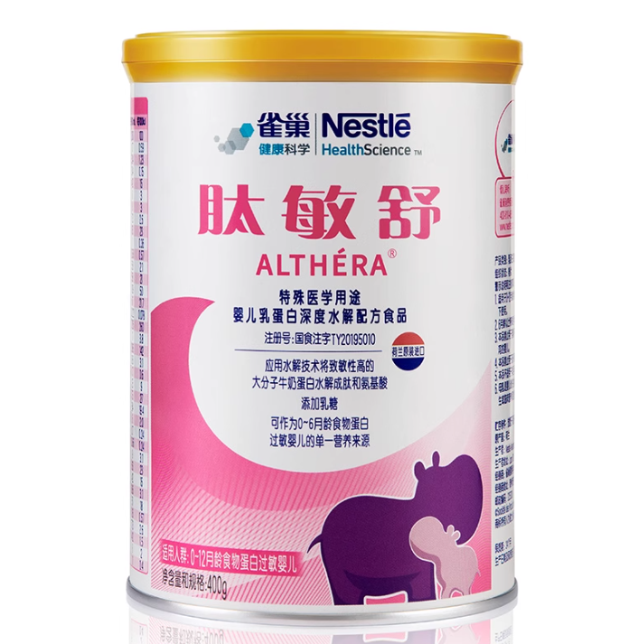 肽敏舒(Althéra®):含乳糖深度水解配方。適合輕中度過敏且腸道狀況良好的寶寶,口感是深度水解中較好的,適合長期喂養。